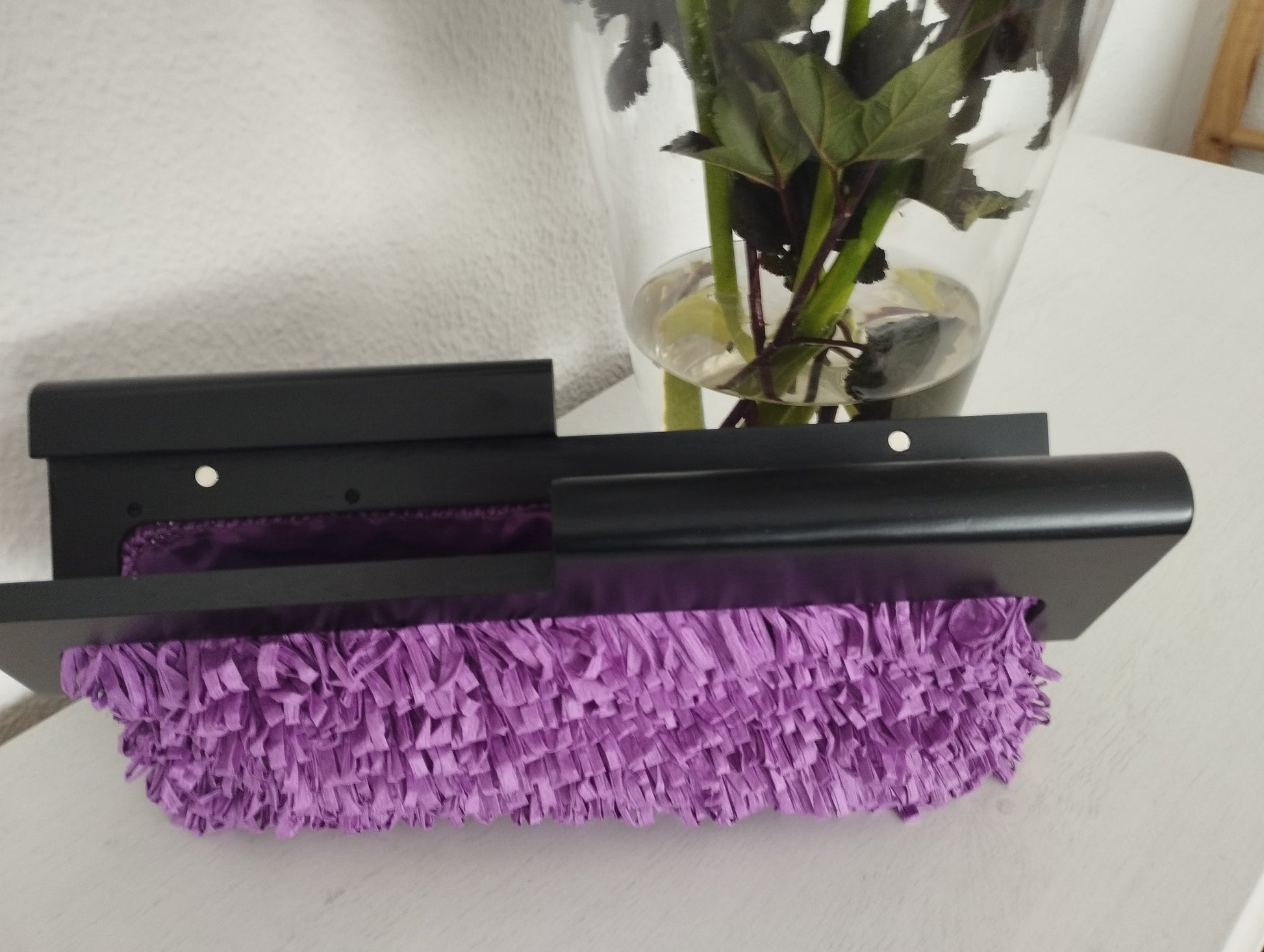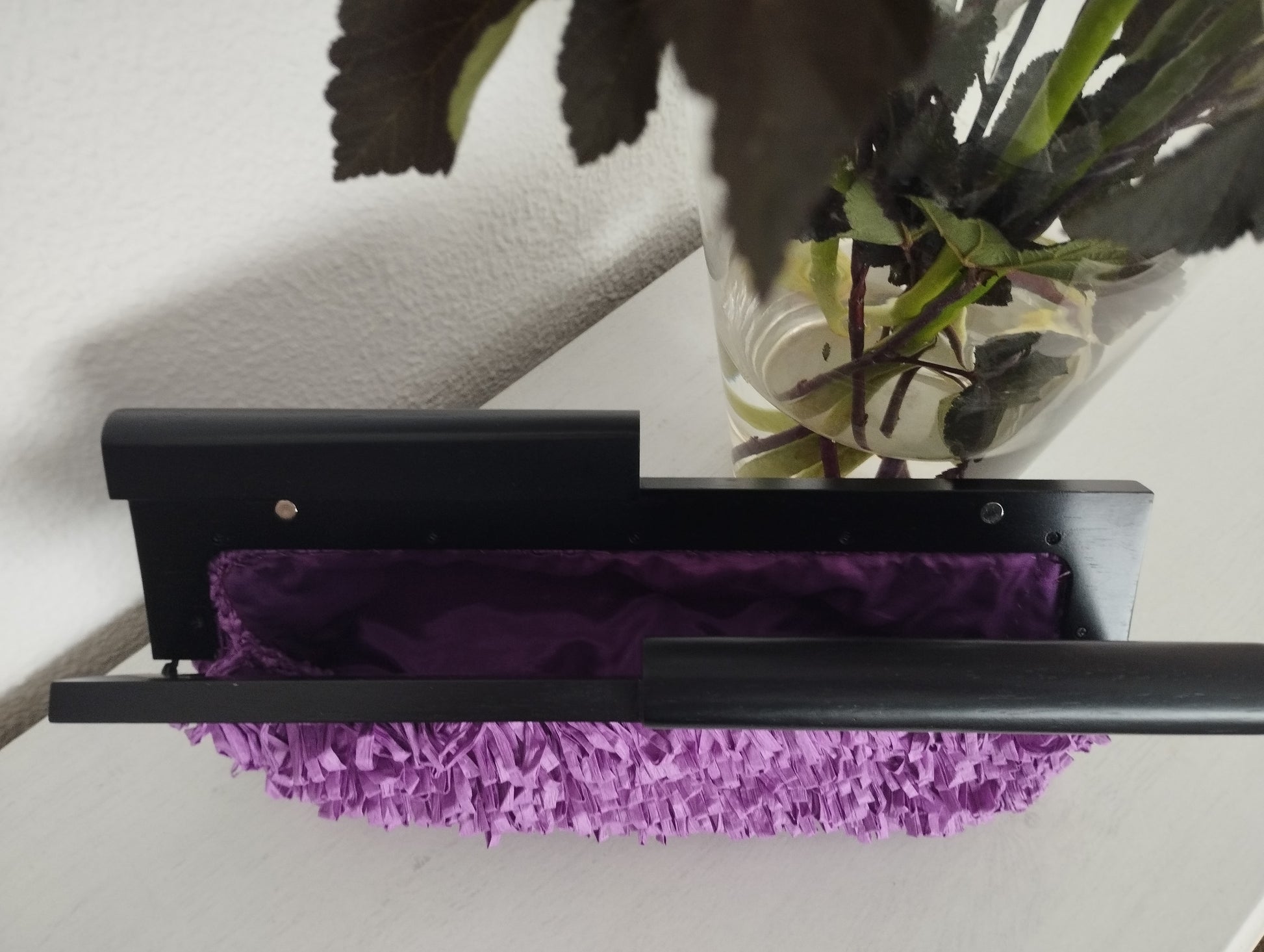 Descubre la nueva cartera "Ana", tejida a mano con rafia de color lila y terminada con una asa de madera en negro. Esta cartera de mano, con sus 30 cm. de largo por 15 cm. de ancho, es ideal para llevar todas tus cosas con elegancia.